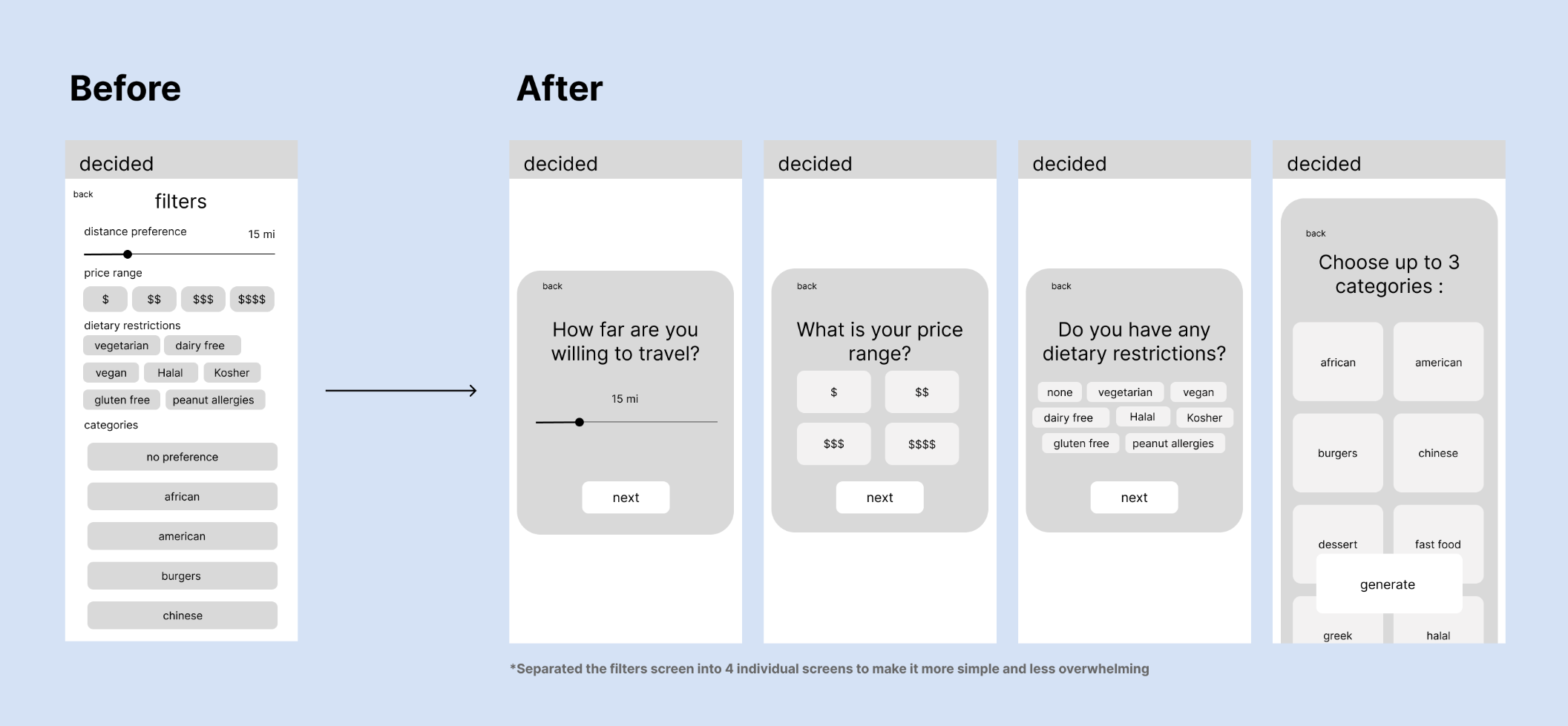 I created multiple paper wireframe iterations, and I eventually landed on this iteration that would address user pain points. I prioritized a quick and easy survey process that would generate restaurants based off the choices they made.