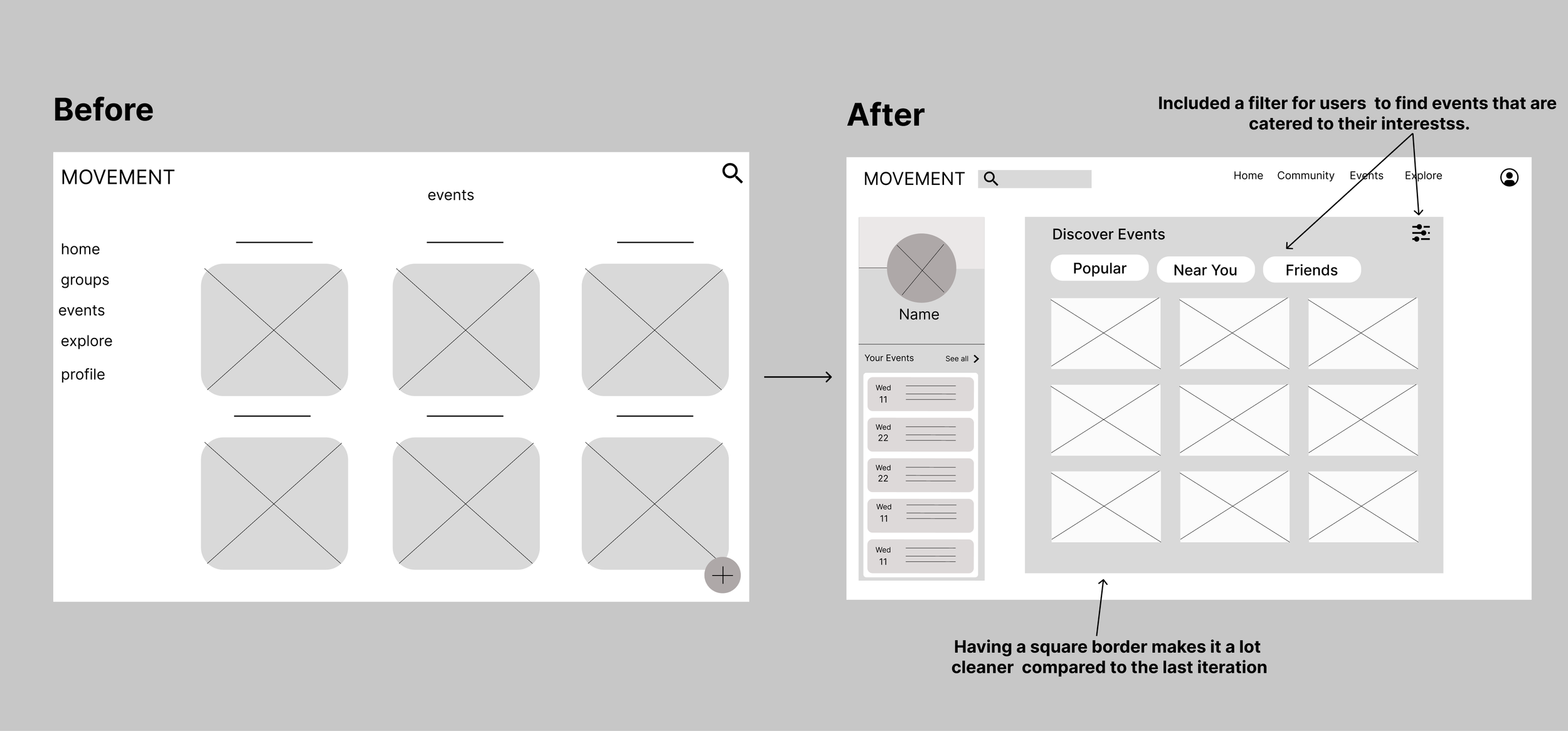 3. Change layout for the ‘Events’ page because it’s harder to separate by categories, so it’s more impactful to have a filter/sorting system (they can also search to find more specific things).